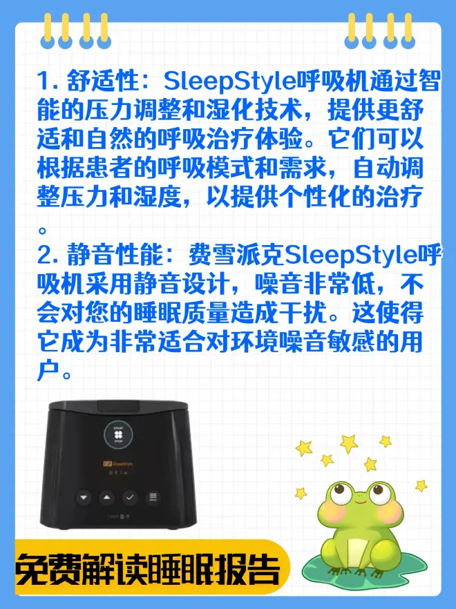 费雪派克SleepStyle系列呼吸机具有以下优点: 舒适性:SleepStyle呼吸机通过智能的压力调整和湿化技术,提供更舒适和自然的呼吸治疗体验。它们可以根据患者的呼吸模式和需求,自动调整压力和湿度,以提供个性化的治疗。 静音性能:费雪派克SleepStyle呼吸机采用静音设计,噪音非常低,不会对您的睡眠质量造成干扰。这使得它成为非常适合对环境噪音敏感的用户。 便携性:SleepStyle呼吸机具有小巧轻便的设计,方便携带和使用。它们适合在家中使用,也非常适合旅行和户外活动。另外,它们还支持内置电池,能够在没有电源插座的情况下继续使用。 智能化功能:SleepStyle呼吸机集成了一系列智能化功能,如带有睡眠追踪和报告的MyAir App、自动启停功能等。这些功能可以帮助用户了解和监控自己的睡眠状况,并根据需要调整和优化治疗设置。 高品质制造:费雪派克作为知名品牌,他们的产品具有高品质和可靠性。SleepStyle呼吸机经过严格的质量控制和测试,确保其稳定性和持久性能。这使得用户能够放心依靠这些呼吸机进行长期的治疗。 总之,费雪派克SleepStyle系列呼吸机以其舒适性、静音性能、便携性、智能化功能和高品质制造而受到用户的青睐。它们能够提供个性化和持续的呼吸治疗,改善睡眠呼吸障碍并提升睡眠质量。
