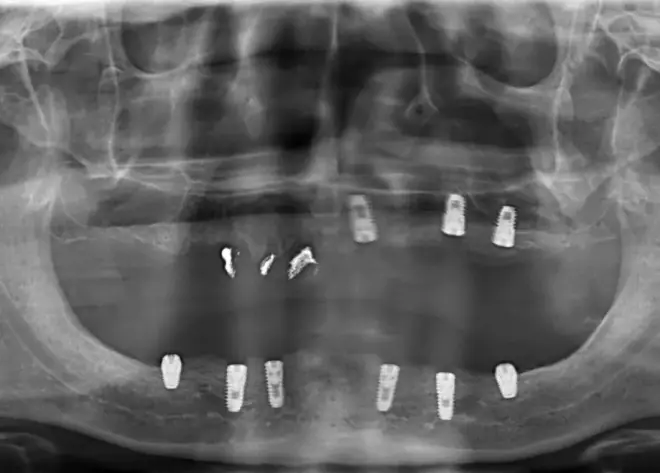 经过一番检查,江文彬医生发现阎叔叔的口腔情况非常糟糕,因为长期佩戴假牙的原因,导致牙槽骨被严重吸收,骨量不足,导致种牙非常困难。万幸的是,骨增量种植技术也是江文彬医生的拿手好戏。根据这位叔叔的牙周以及牙槽骨情况,最终江文彬医生为这位叔叔定制了全智能精控骨增量种植方案,在其上下颌各植入4颗植体,最终为这位戴了多年活动假牙的叔叔成功修复了全口牙。