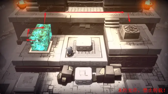 步骤5:控制左平台中心处的石块,通过左边小台阶,从另一个石块上移动至上面平台,并从上面平台移动至右边平台(此时不要压住右边平台上的机关)。116.5