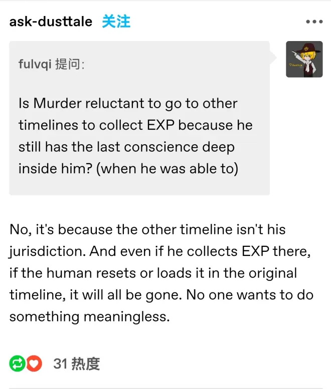 9. Murder不会前往其他AU猎取Exp,因为他根本没有AU穿梭能力,同样他获取的EXP也会随人类重置Dusttale而消失