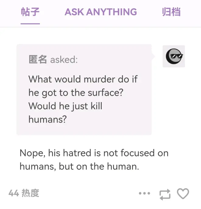 1. Murder对人类的不信任是根深蒂固的,他并不认为其他宇宙的人类就一定有多善良,但在一般情况下不会随便动手,如果那个人类和DustTale的人类是一类货色的话,Murder就极有可能去杀ta,哪怕这会使其他AU角色震惊。