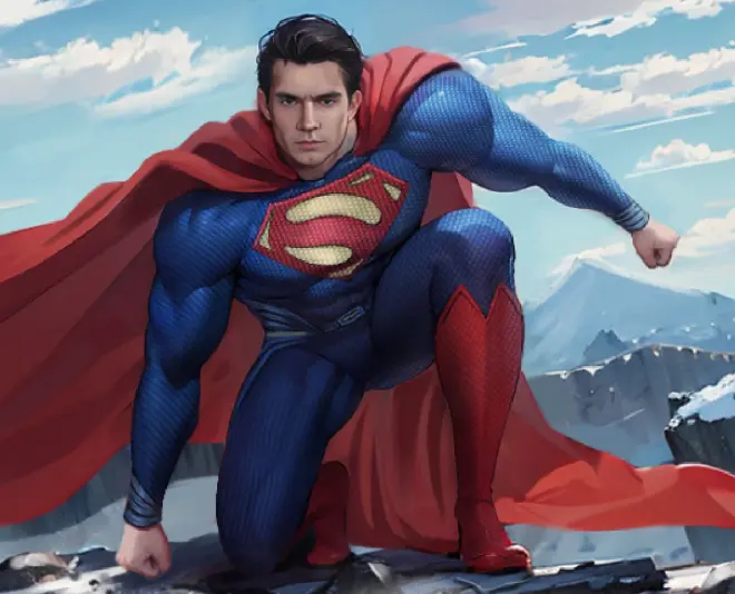正向关键词:男性焦点,超级英雄,黑发,写实,单膝跪地,紧握拳头,红色靴子,户外,深蓝色紧身衣,蓝天,白云,红色斗篷,看着观众,破碎的岩石地面,碎石,凹陷,(雪山 1.1)(雪山 1.2),阳光。