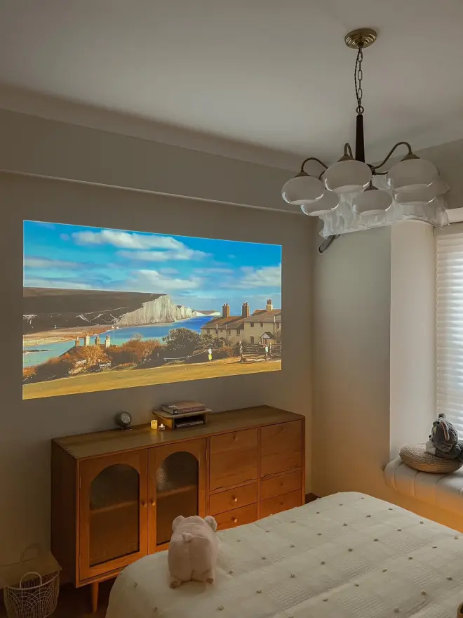 床尾空间布置了一组复古风装饰柜,墙面则做了留白处理,投影仪可以直接投屏上墙,躺在床上就能追剧、看大片,太羡慕这样的生活了!