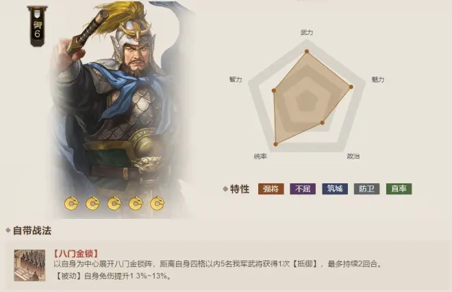 以自身为中心展开八门金锁阵,距离自身四格以内5名我军武将获得1次【抵御】,最多持续2回合,冷却时间3回合。