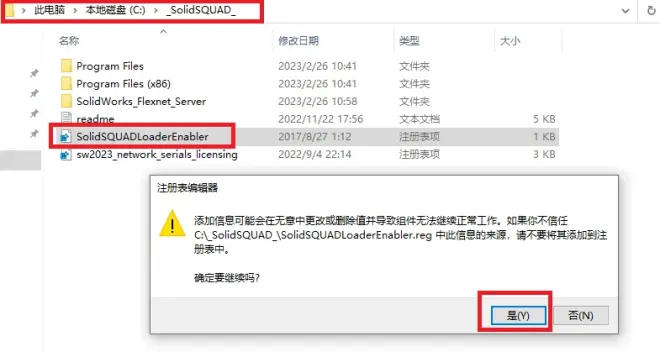 8、返回_SolidSQUAD_文件夹,双击运行sw2023_network_serials_licensing,出现提示信息选“是”