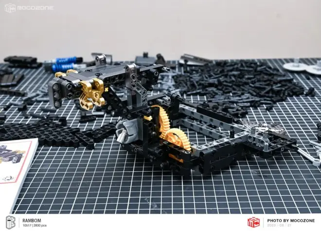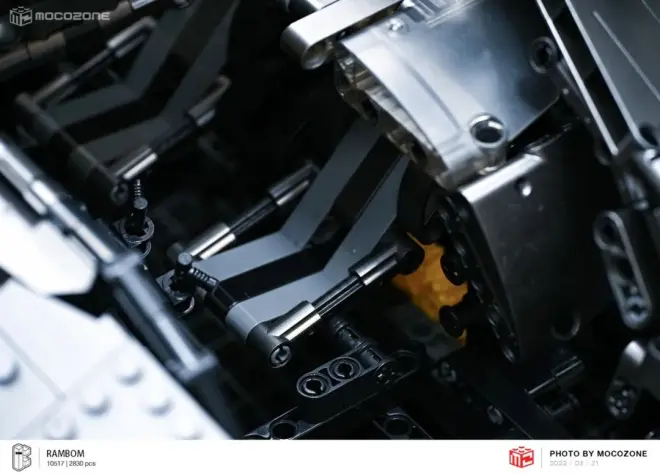 拼搭是从后面开始进行的,因为绝大部分的结构都是采用科技零件来拼搭实现,所以在设计上只直接将弹簧悬挂加入其中,这一点是让我很惊喜的,并且K盒子也是设计了增加动力组的玩法,虽然动力配件需要另购,但是还是直接预留了接口,直接安装即可。
