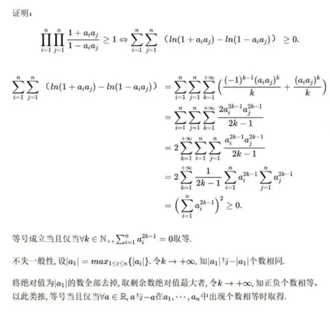 这道题主要考察幂级数和取对数的技巧。通过对不等式取对数,再用对数函数的Taylor级数,可以写成完全平方式求和的形式。