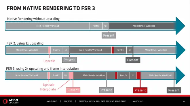 AMD方面称,他们目前正在优化FSR3的延迟问题,优化游戏体验,并简化从FSR2到FSR3的升级路径。AMD确认了FSR3技术将会继续开源,且一旦准备就绪,那些支持DLSS3的游戏也可以快速加入到FSR3的支持中。