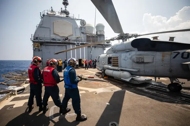 提康德罗加级导弹巡洋舰邦克山号(CG 52)的飞行甲板上,水手们在进行航空消防演习时与模拟火灾搏斗。
