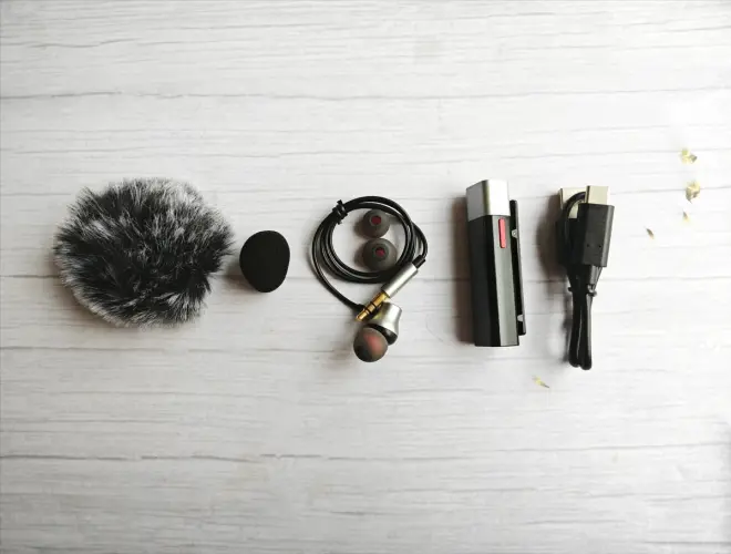 塞宾智能麦克风的包装精致简洁,打开包装后,可以看到麦克风主体,一个耳返,防风罩,海绵罩,充电数据线以及说明书。