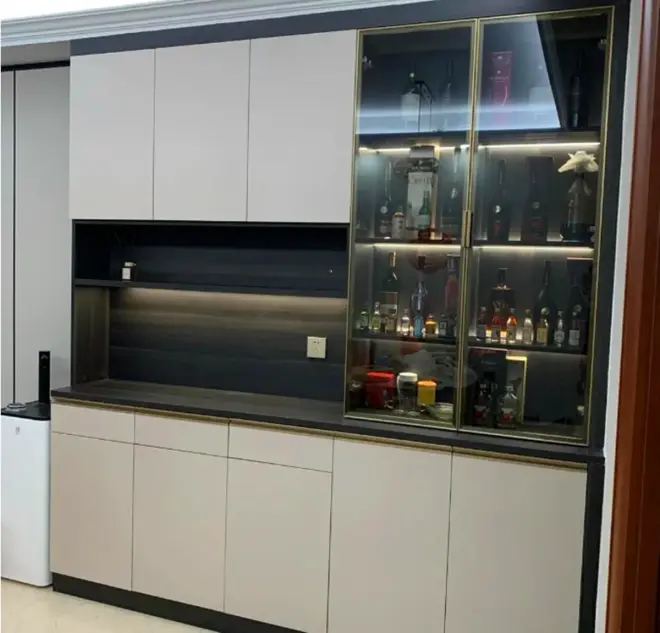 而且餐边柜上下两部分封边外露会破坏柜体整体性,若搭配的封边板材与柜体颜色不一致,更加影响外观,建议将封板隐藏在柜体内侧,这样一来,餐边柜会更显高级。