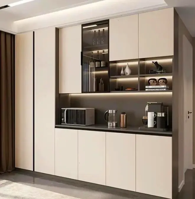 餐边柜顶部切记别悬空,除非是真的有这样的设计必要,不然既不美观,也容易形成卫生死角。