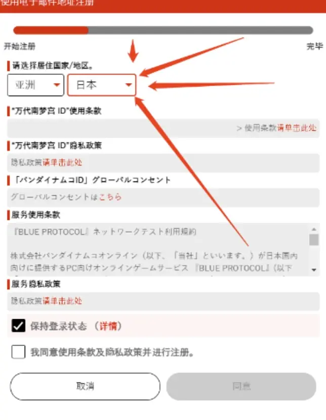 注册时一定要仔细填写信息哦!可以使用常用的苹果、Facebook等平台账号来协助完成万代南梦宫ID的注册,也可以用电子邮箱注册,简单方便!