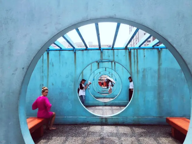 盘旋的圆,旋转的方,钢筋水泥里藏着桃粉、油绿、瓦蓝的明媚。很多都带着上世纪的复古色彩。