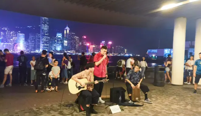 驻唱歌手,唱着李荣浩的《李白》,一圈人环绕欣赏,自由的空气在弥漫!