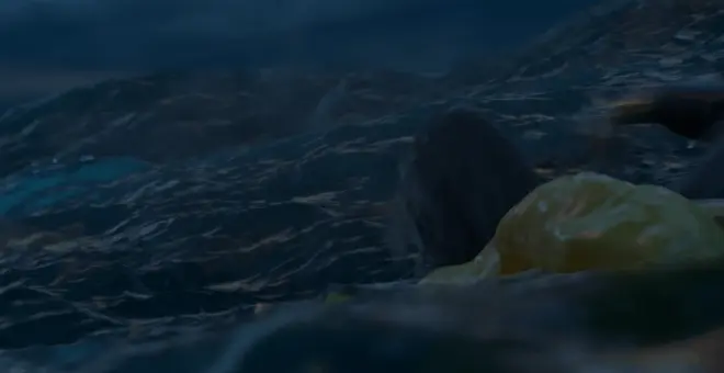 30.深海电影院的动画放映接近结束时,南河在屏幕前跳舞,片中的BOSS(参宿)在动画中跳舞,同第21条相似,两人的动作都非常像现实中海面上遇到搜救船时的呼救动作。