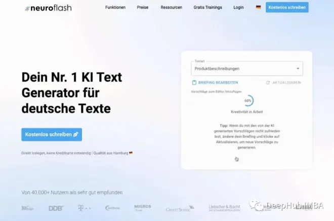 那么 Neuroflash 就主要服务于德语内容生成器。Neuroflash 基于 GPT-3.5 构建的聊天助手是 ChatGPT 的绝佳替代品。与 ChatGPT 和其他类似工具不同,Neuroflash 不需要单独的用户界面——它可以在常规文本编辑器中轻松访问,与 ChatGPT 一样,Neuroflash 也可以编写代码。遗憾的是没有像ChatGPT那样的语法高亮。