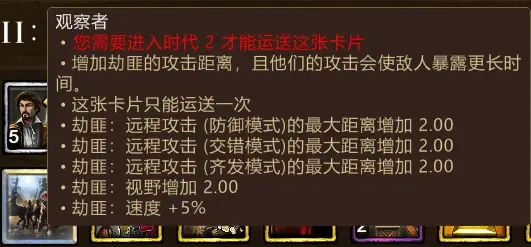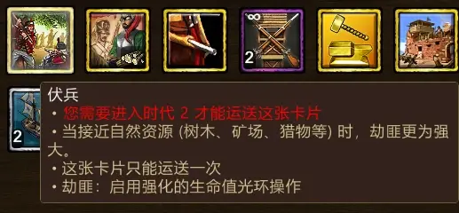 观察者这张卡在游戏中的效果为增加劫匪的攻击距离,且他们的攻击会使敌人暴露更长时间。伏兵这张卡在游戏中的效果为当接近自然资源时,劫匪更为强大。游击战术这张卡在游戏中的效果为提高劫匪的战斗力,并给予他们“游击战术”能力大按钮。总之,这些卡都是为了更好地发挥劫匪的游击作战能力。大家在使用劫匪时一定要牢记,敌进我退(开隐身逃跑),敌驻我扰(利用增加的射程狠狠白嫖火枪),敌疲我打(在小树林里开生命光环决战),敌退我追(利用攻击敌人后的视野进行追击),打一场漂亮的游击战吧!