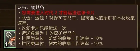 在游戏中这张卡的效果是运送一辆探矿者马车,提高全队的采矿和木材收集速率。送来的探矿者马车可以变成铜矿。但事实上,虽然铜峡谷被叫做“铜峡谷“,但它的铜矿含量极少,起这个名字只是因为其铜绿色的岩壁。联系上文,或许送来一个银矿更符合史实吧…