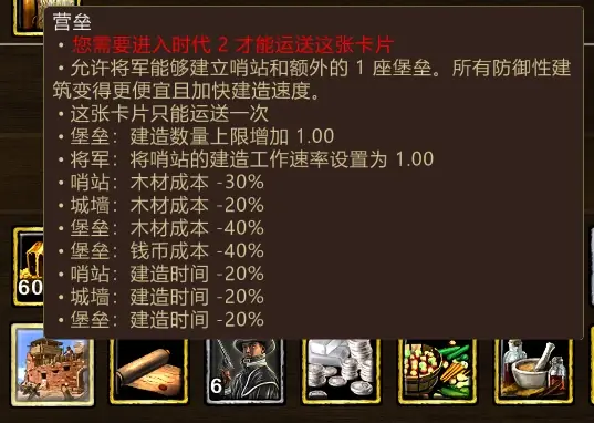在游戏中这张卡的效果是允许将军能够建立哨站和额外的一座堡垒,所有防御性建筑变得更便宜且加快建造速度。这张卡的效果很可能反映的是,当时的西班牙殖民开拓者和美洲原住民经常爆发冲突,为此殖民政府在聚居区大量建设Presidios。这也是制作组鼓励玩家效仿当时的西班牙殖民者,用哨塔和大堡垒控制资源区和推进阵地,逐步压迫对方的生存空间吧。(去湖多线不好,真的很容易被跑马D农,或许可以发这张卡?)