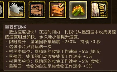 在游戏中这张卡的效果是运送500食物,摧毁敌方建筑或己方建筑被摧毁均会获得食物。哇!500单位的辣椒干,农民居然开箱子吃得这么快,不愧是纯正的墨西哥人。至于为何“干辣椒“会和“战术”产生联系,很抱歉去湖没能查到有关内容,只能留待大家补充了。只是Chipotle确实是经过熏烤制成的,或许这也能勉强解释为什么烧房子给食物吧。