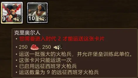 在游戏中这张卡的效果为运送一批强大的火枪兵,并允许堡垒训练此单位。早期的克里奥尔人完全过着西班牙式的生活,其实就是西班牙人,因此送来9个西班牙火枪兵是完全没问题的。(去湖其实还挺喜欢发这张卡的,9个火枪一出来底气都足了。就是不知道性价比如何…)