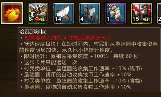 在游戏中这张卡的效果是在短时间内,村民从垦殖园中收集资源的速度明显加快,永久地小幅提升速度。相较于Jalapeno,Habanero更辣,这也解释了为什么哈瓦那辣椒这张卡的持续时间更长吧。