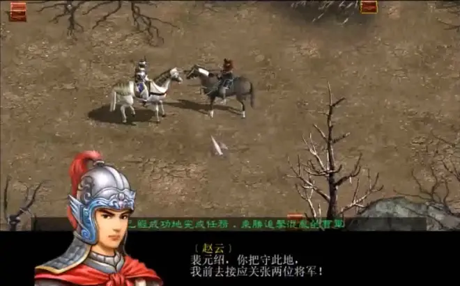 题外话说完,在整备完成后赵云去向貂蝉辞个行就能前往博望坡诱敌了,这里一度让我卡关,因为小时候显示器分辨率不高并且对于文字似懂非懂,所以不知道直接逃跑,也不懂后面如何“发火”,因此20秒一浪费就直接失败了,在遇到夏侯惇以后直接回头,开了宝箱就发火了,这里不能存档,读取会出BUG直接判定失败。在发火之后这一段就直接跳过,开后台改数据秒杀夏侯惇也会导致游戏失败。追击之后赵云看到关羽张飞已经在兵堆里冲杀,赵云冲杀一阵后迎面撞上了溃败殿后的曹军统帅,赵云愣在了原地。