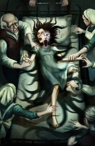 爱丽丝哭喊起来。(场景切换)爱丽丝向四周宣泄着她无尽的痛苦,出现的护理人员竭力把她按在床上,爱丽丝朝他们大叫着,甚至撕咬了上去。那是一头愤怒的怪物正在嘶吼。她陷入了彻底不受控制的癫狂之中,闪现的阴影逐渐与她扭曲的面庞合为一体。