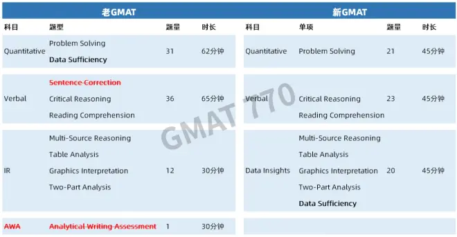 ③调整:数学部分被拆分,Data Sufficiency移出数学与原本IR的四个题型组成新的单项Data Insights,而Problem Solving单独构成数学部分。
