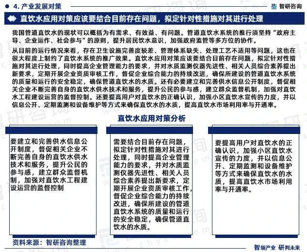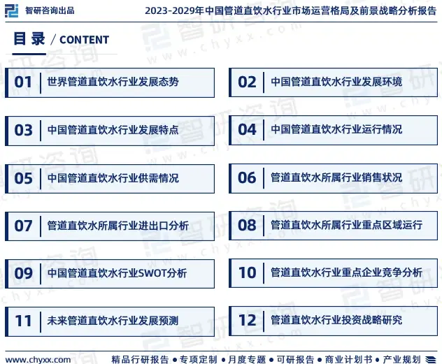 为方便行业人士或投资者更进一步了解管道直饮水行业现状与前景,智研咨询特推出《2023-2029年中国管道直饮水行业市场运营格局及前景战略分析报告》(以下简称《报告》)。报告对中国管道直饮水市场做出全面梳理和深入分析,是智研咨询多年连续追踪、实地走访、调研和分析成果的呈现。