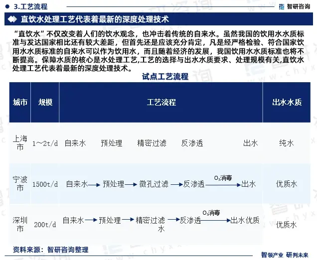 “直饮水”不仅改变着人们的饮水观念,也冲击着传统的自来水。虽然我国的饮用水水质标准与发达国家相比还有较大差距,但首先还是应该充分肯定,凡是经严格检验、符合国家饮用水水质标准的自来水可以作为饮用水,而且随着经济的发展,我国饮用水水质标准也将不断提高。保障水质的核心是水处理工艺,工艺的选择与出水水质要求、处理规模有关,直饮水处理工艺代表着最新的深度处理技术。