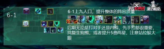 8人口之后存钱要不要大D看分段,比如白金左右,就卡着50利息慢慢悠悠抬2星质量即可,抬到6-1差不多凑了一些小菊狗熊什么的,直接拉9人口挂上去,然后慢慢找5费两星就行了。阵容前期该做的都做完了,不要找主C的后期就很轻松。