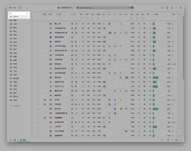 3、原月销列变更为"排行"列,在市场,项目,开盘,户型中统一变动,以销量为依据进行排名,大成都拉通。