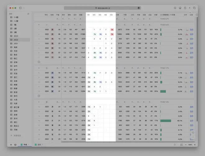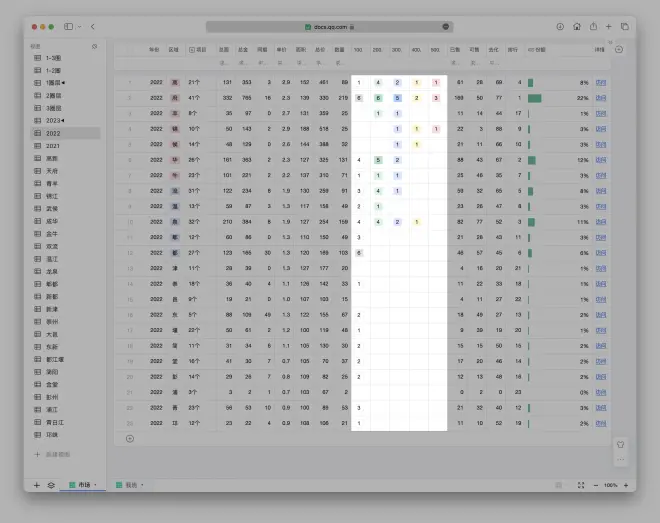2、2021~2023视图中100.~500.的销量份额从各圈层拉通到大成都,1表示对应区域价位在大成都已售新房的占比约在1%,取整不足1%的不显示,见配图2。