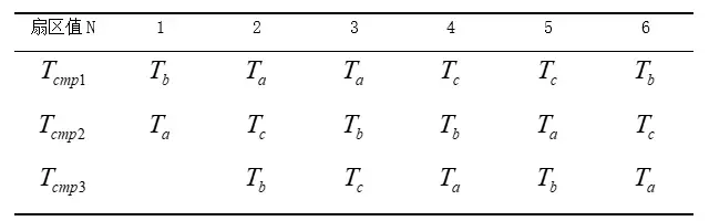 ABC由判断扇区公式可知道组合为6种。𝐴、𝐵、𝐶取不同的组合对应着不同的扇区,此可由𝐴、𝐵、𝐶的组合判断所在的扇区。为区别扇区的六种状态,令:𝑁 = 𝐴 + 2𝐵 + 4𝐶,则𝑁具体对应关系如表1所示: