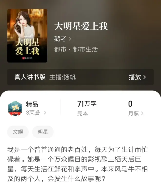 不知道为什么他没在《大明星爱上我》《女神保护人》《诱惑》这些已经完本的小说里也发个通知,我记得起点的这些完本小说是可以发新书通知的,要不然应该会有更多一点的读者找过去的。