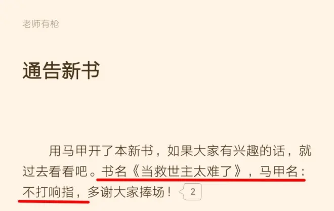 正好他的马甲“不打响指”的新书《当救世主太难了》就是7月22号开始在起点连载的,时间上挺吻合。