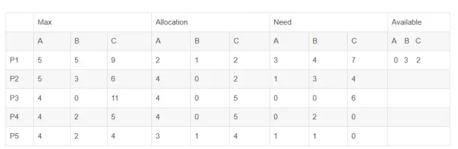 可利用资源向量Availabel=(0,3,2),大于Need中 P4 所在行的向量(0,2,0),因此可以满足 P4 的运行。P4 运行结束后,系统的状态变为: