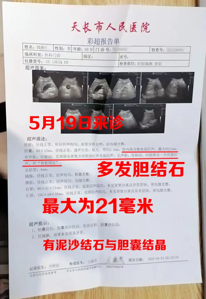 7月24日反馈报告单:结石从多发变为单一结石,减小5毫米为16毫米,胆泥与结晶消失,透声尚可。