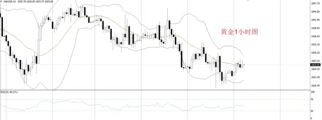 根据黄金1小时图看,K线在布林带中下轨运行,反弹后会继续出现震荡下行的状态。上方作为阻力1825附近做空,下方作为支撑1820附近做多。