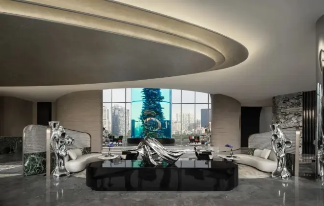 由GID设计执笔的长沙旭辉 · 铂悦湘江售楼处,将海底世界箱引入售楼空间,为当今地产展示空间设计缔造了全新的记录,亦创造出前所未有的奇观式体验。设计师Gary曾建龙希望以差异化的设计策略,让整个室内围绕一个巨大的水族箱展开视觉盛宴,以艺术性的震撼构筑长沙的诗意生活方式。