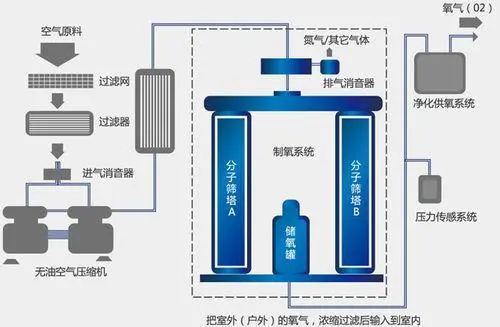 制氧机的工作原理是利用压缩空气和分子筛的吸附性能,通过周期性地改变压力,使分子筛吸附空气中的氮气,从而获得高纯度的氧气。这种方法叫做压力变换吸附法(PSA),是目前最先进和最经济的制氧技术之一。