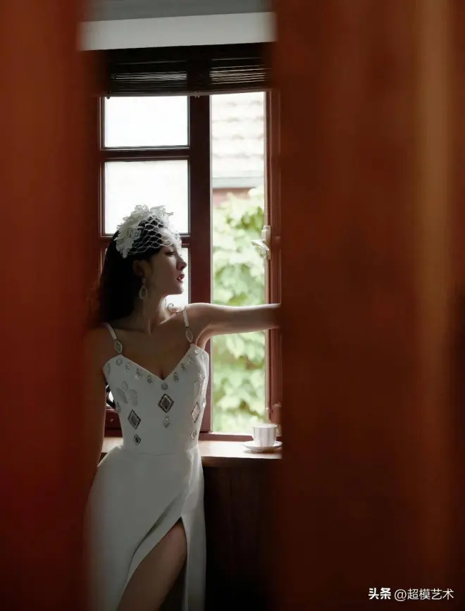 轻纱发冠、卷发与红唇交相辉映,营造出复古与现代融合的独特美感。