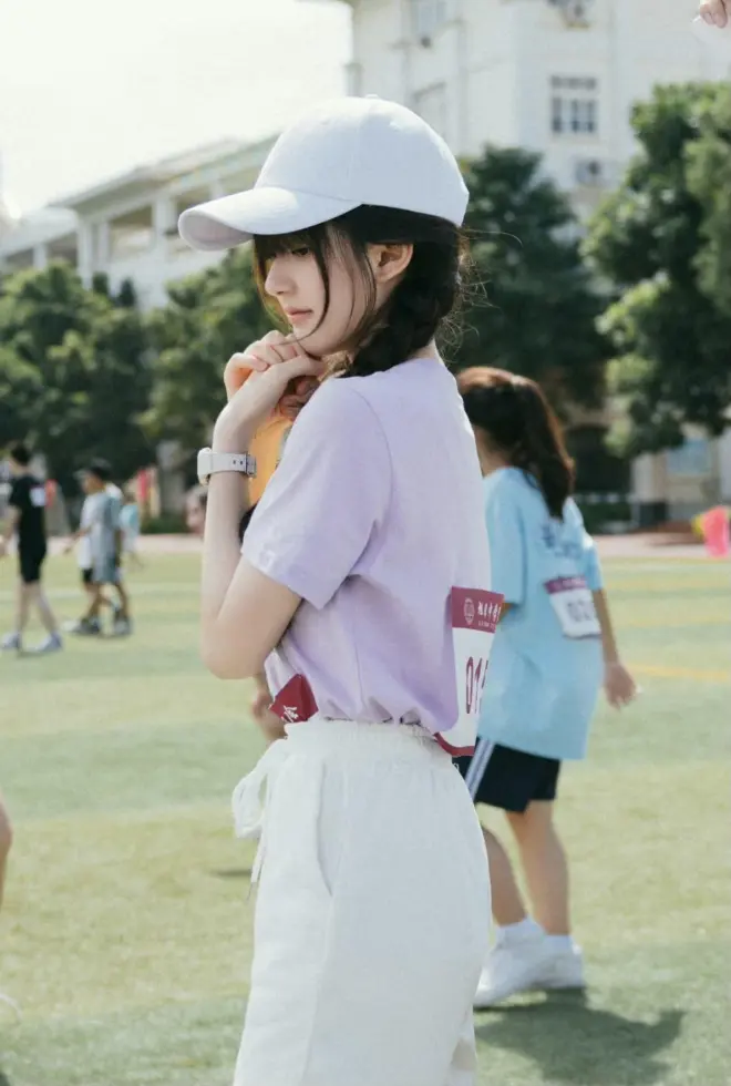 参加运动会的桑稚也太青春了吧!莫兰迪紫色T恤搭配白色运动短裤,双马尾搭配白色鸭舌帽,女高中生的稚嫩感和青春感轻松get。或许赵露思的长相也偏向童颜,演高中生毫无违和感。