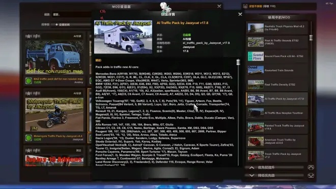 以下大多为外部模组可在模载联合下载,本人也创建了一个群分享模组文件,但可能不是最新版,因为ai外部模组一般不会随版本更新而失效(点名批评promods)所以群里的大多不是最新版本需要最新版本请转至模载联合下载,以下模组我也不打名字了(除了steam模组),模载联合的AI分类页能很快找到(绝不是因为我懒)