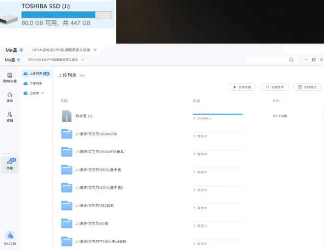 Me盒客户端支持大文件快速传输,不受文件大小限制,上传下载速度也不受限制,同时也不会进行压缩。对于相同的文件,Me盒客户端会使用秒传技术,大大加快了文件的传输速度。根据实测结果,本地上传速度达到了25.6MB/s,非常快速。