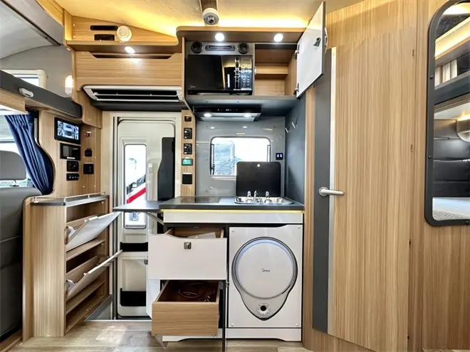 厨房区域内嵌电磁炉及赛特福德带盖洗手池,主台面右侧可拓展一张35x50(cm)的置物台,进一步扩大了厨房操作面积。卫浴间独立式设计,配置了欧式折叠水槽,节约空间,增大卫生间内部的可使用面积、房车专用马桶、毛巾架、置物格、储物柜都有配置,满足日常的洗浴和如厕需求。储物柜上是镜子设计,有效增大视觉效果。