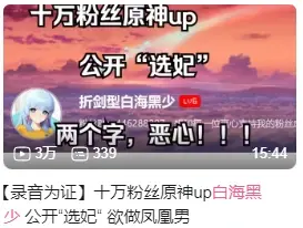 在21年被大量玩家,群友,up甚至给其视频配音的女cv公开发视频点名,大部分内容都是有关白海黑少对于女性的态度和行为。