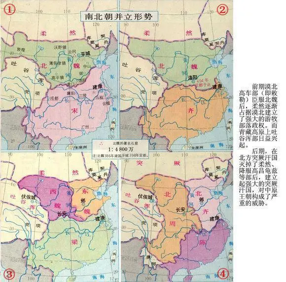 由于南北朝时期政权更迭频繁,年年征战,疆域面积变动性很大。期间,北魏孝文帝拓跋珪汉化改革、西魏八大柱国,影视作品陆贞传奇、独孤天下展现的就是这个时代。